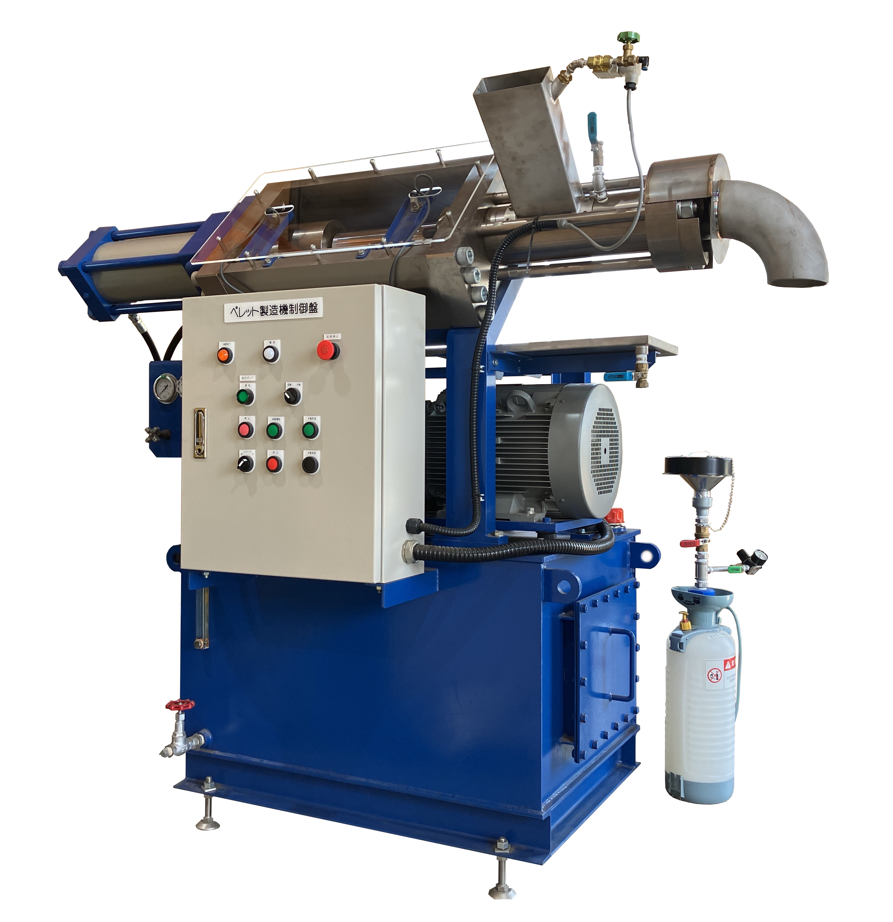 液化炭酸ガスからペレット状ドライアイスを作る装置です。3mm, 6mm, 9mm, 16mmのペレットを作ることができます。
